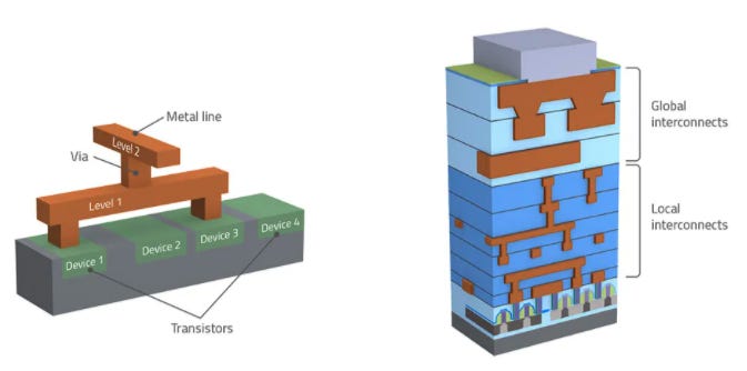 Transistors can be wired together, and with other fundamental electronic devices, using “interconnects”. These form logic gates that physically implement logical operations with binary input and output.