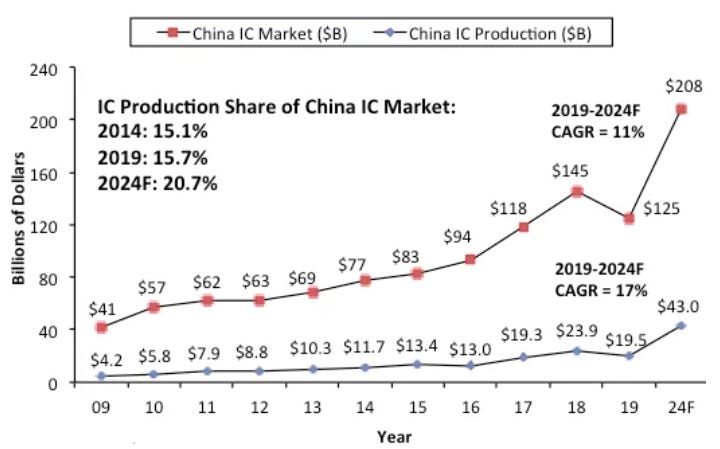 There’s no doubt Beijing’s stimulus will build up the Chinese appetite for compute, but the CCP are keen for this to be home fed. The 14th Five-Year Plan and Made in China 2025 are all about securing technological autonomy. This means reducing imports and closing the production-consumption gap; the goal for semis is to produce 70% of all consumption by 2025.