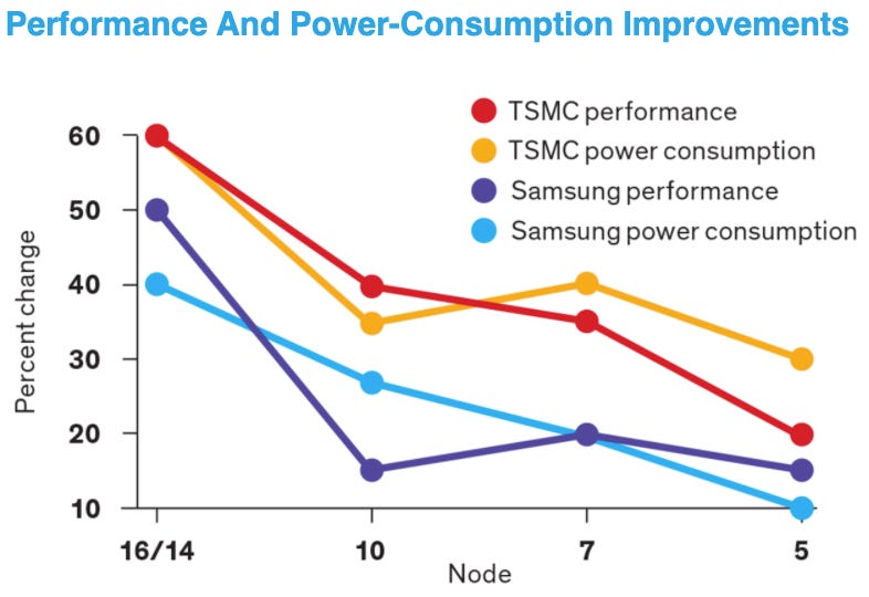 It took me longer than it should’ve to realise the importance of contracts in the foundry game. Apple began testing TSMC’s 5nm process in October 2019 for the A14 chip in the iPhone 12, which then wasn’t being sold in Apple stores until a whole year later. So, I presume for all that time in contract TSMC had secured Apple’s rather large bag.